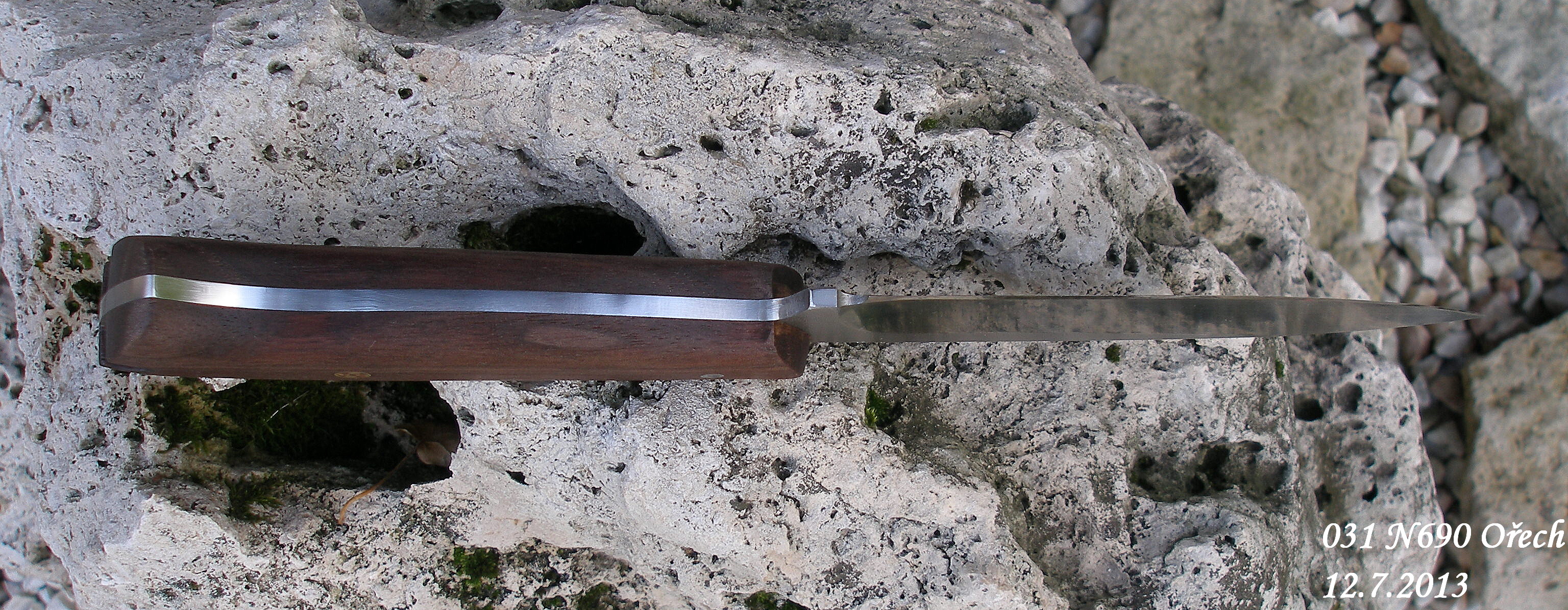 Rukojeť: OŘECH Evropský , 3x nerez kolík /1x skrytý/, lepeno Epoxy 300kg, průvlak na šňůru